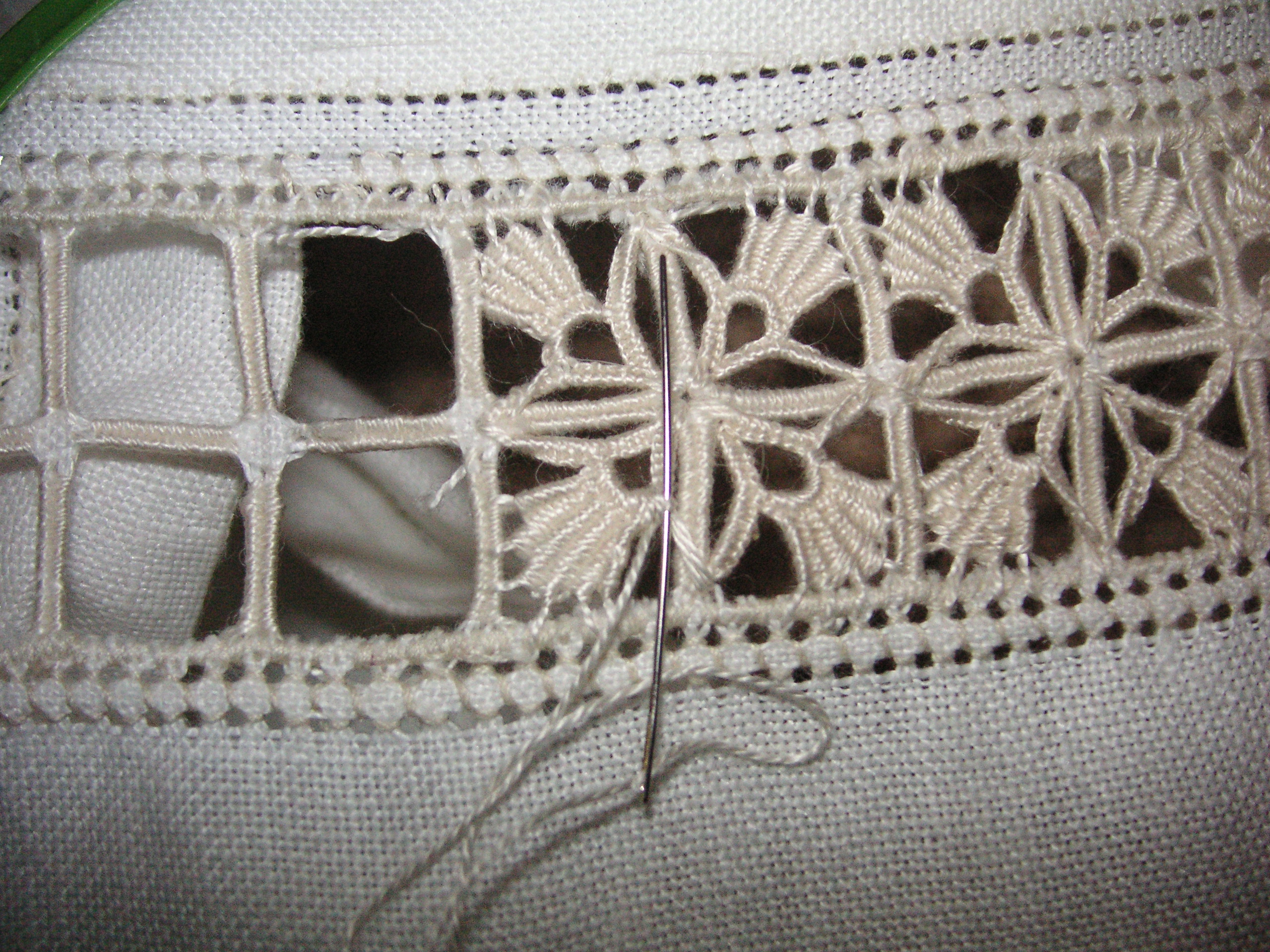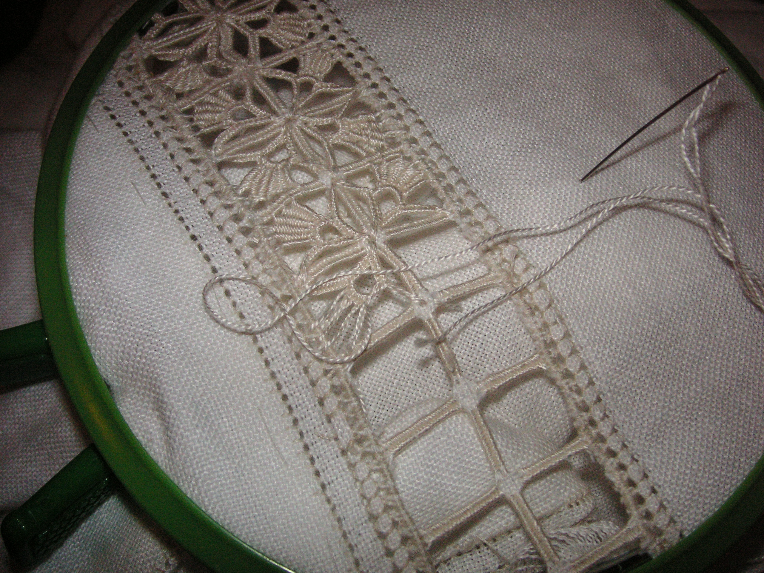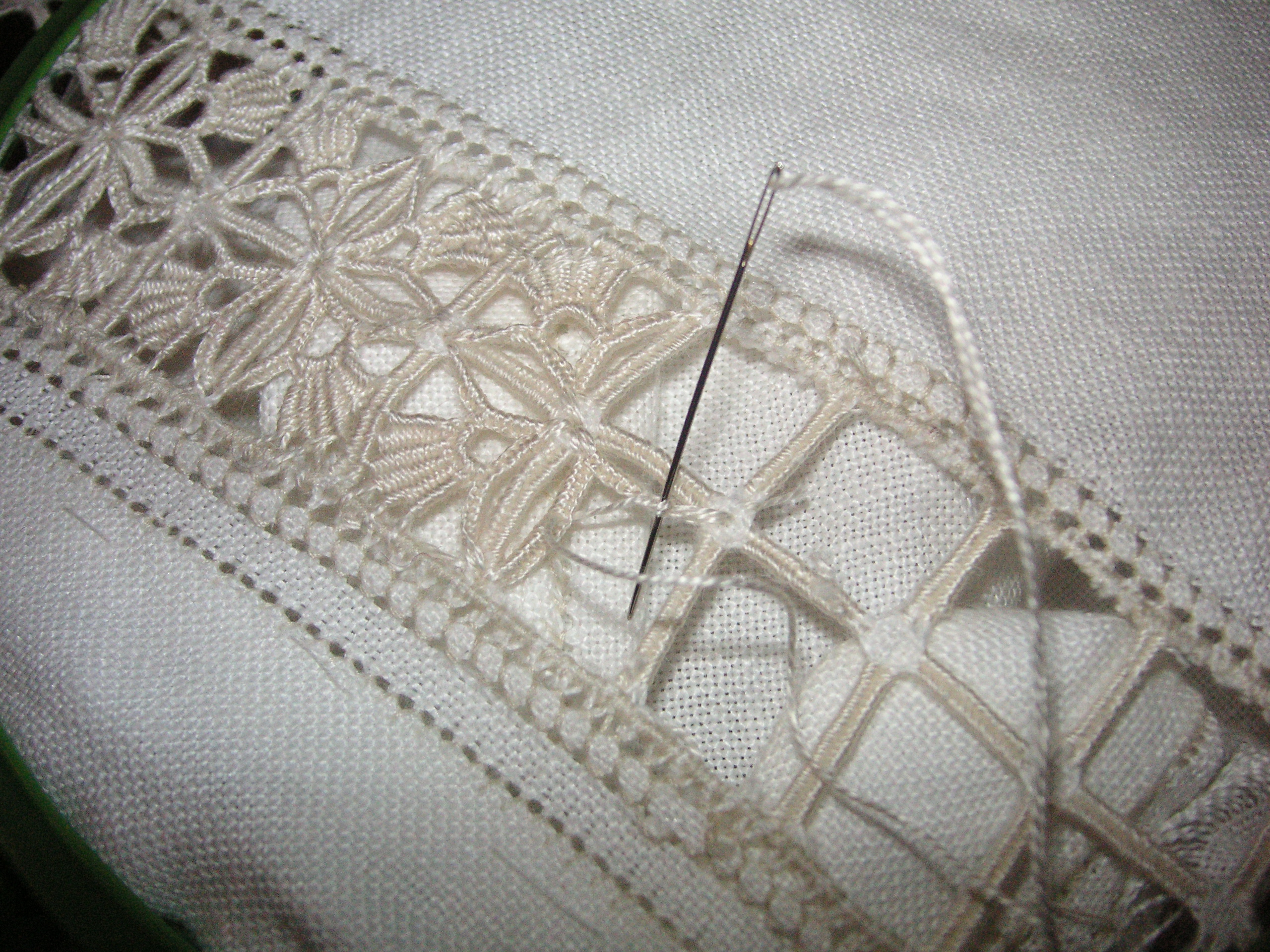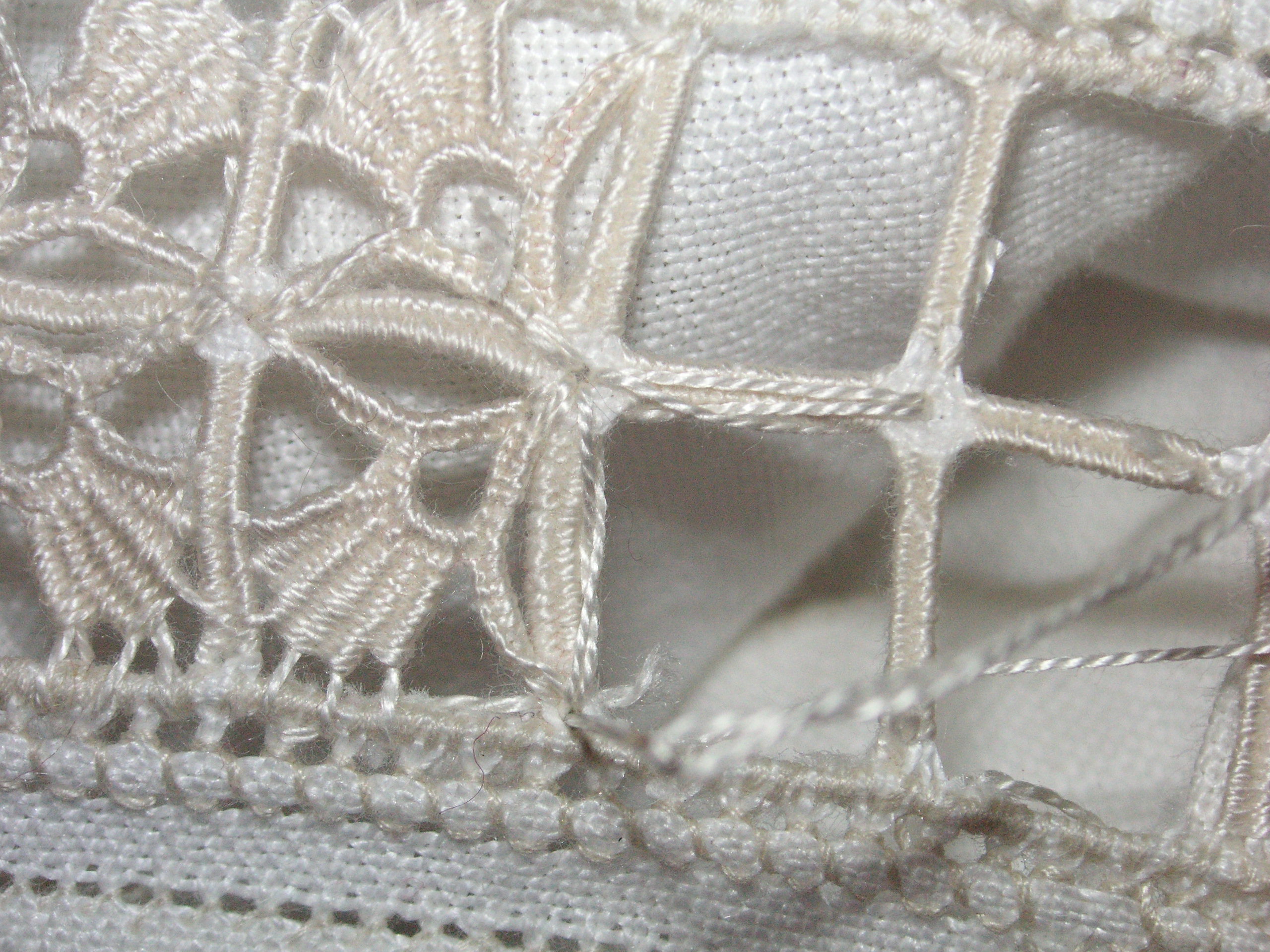 Fate attenzione quando vi aggangiate ,ad entrare nei singoli punti festone da sotto; nel lanciare i fili ai bordi dei quadretti badate di tenere la stessa distanza sui due lati del quadretto stesso; ora vi trovate con una raggera di sei fili lanciati ; siete al centro di nuovo nell’archetto , lavorate un punto festone e ora passando con l’ago fra i fili lavorate a punto tela sui sei fili lanciati fino ad arrivare al bordo del quadretto ; (6 foto ) ;ora lavorate solo su quattro fili sempre raggiungendo il bordo del quadretto (foto 7)e infine lavoratene solo due( foto 8 e 9).