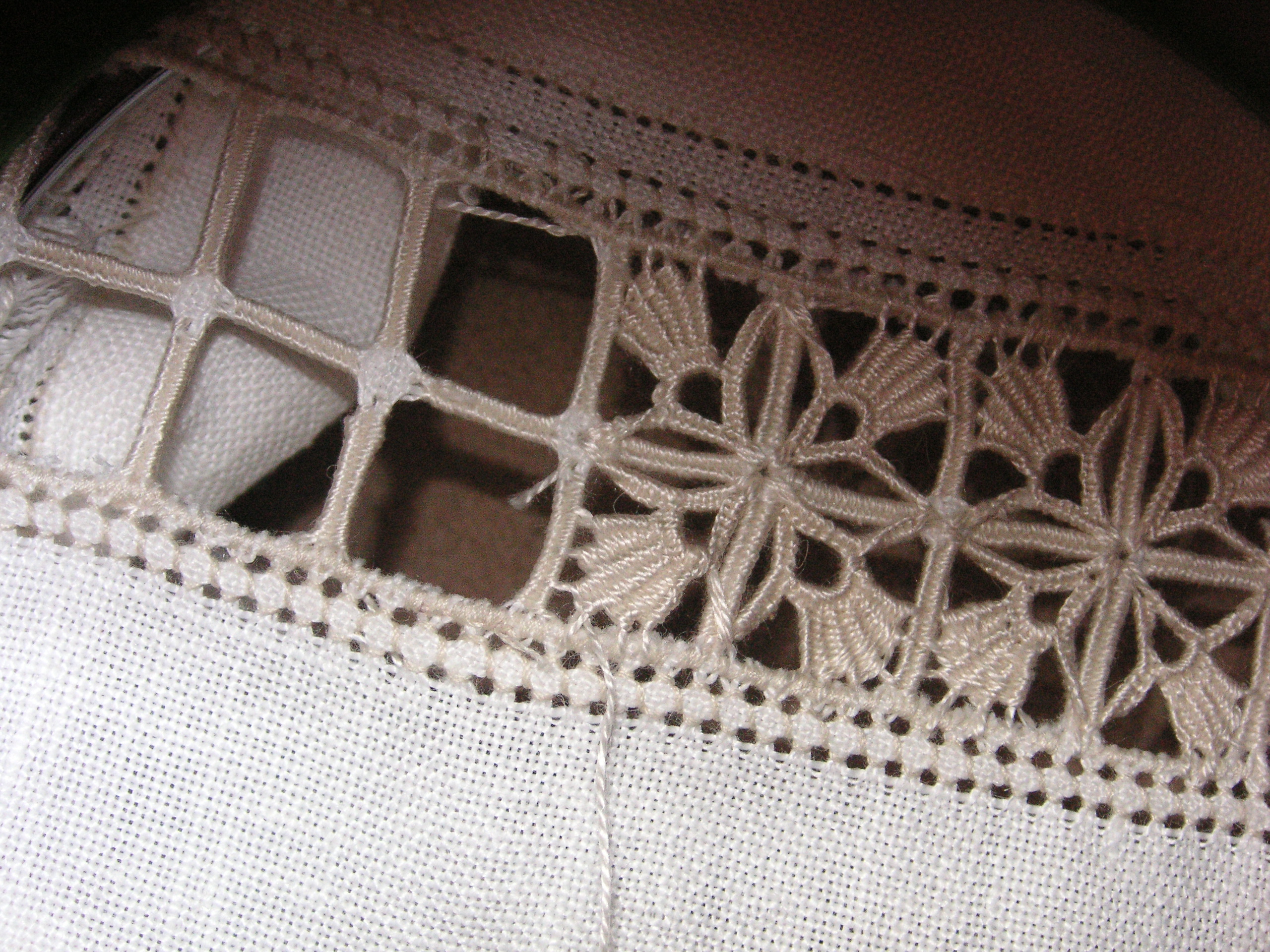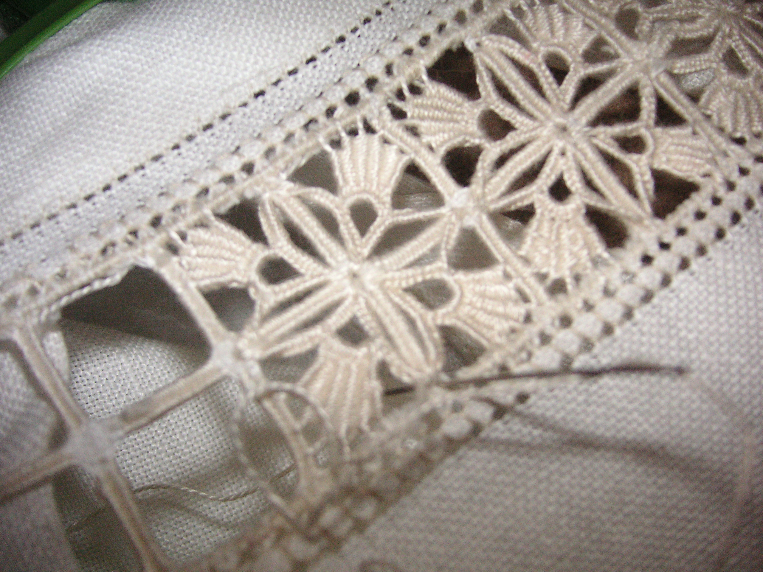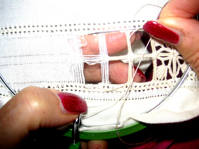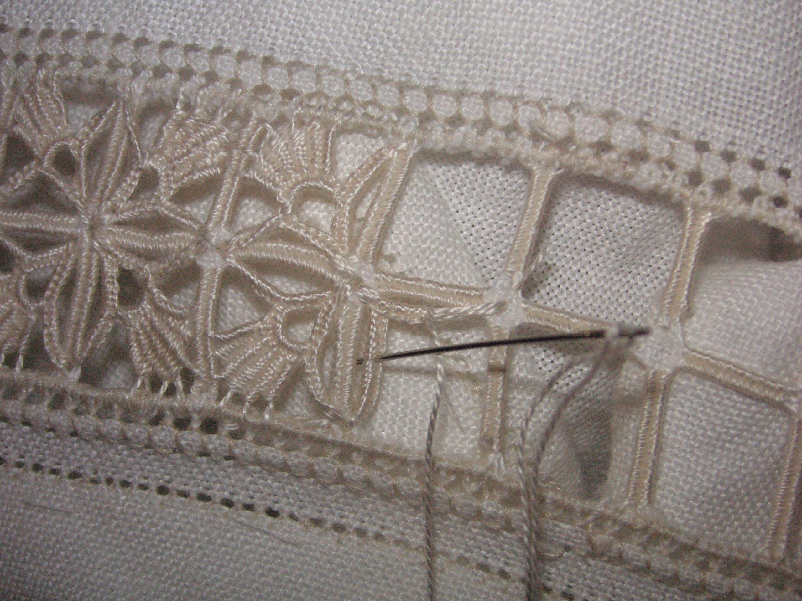 Fate attenzione quando vi aggangiate ,ad entrare nei singoli punti festone da sotto; nel lanciare i fili ai bordi dei quadretti badate di tenere la stessa distanza sui due lati del quadretto stesso; ora vi trovate con una raggera di sei fili lanciati ; siete al centro di nuovo nell’archetto , lavorate un punto festone e ora passando con l’ago fra i fili lavorate a punto tela sui sei fili lanciati fino ad arrivare al bordo del quadretto ; (6 foto ) ;ora lavorate solo su quattro fili sempre raggiungendo il bordo del quadretto (foto 7)e infine lavoratene solo due( foto 8 e 9).