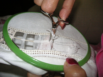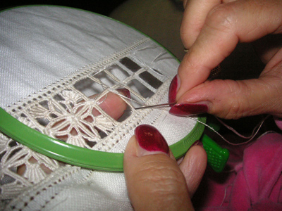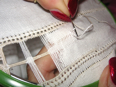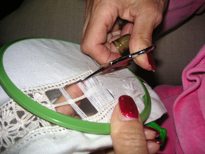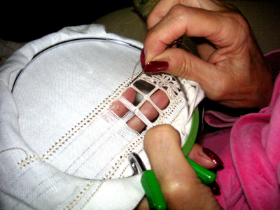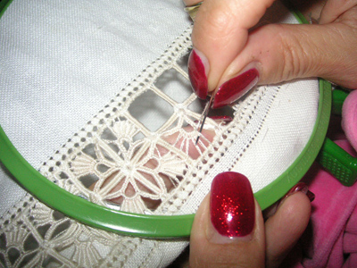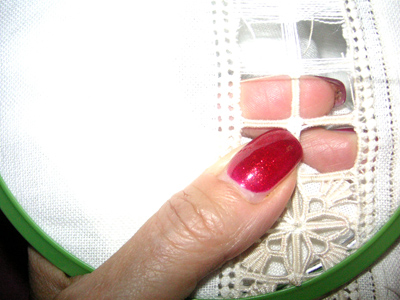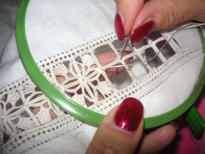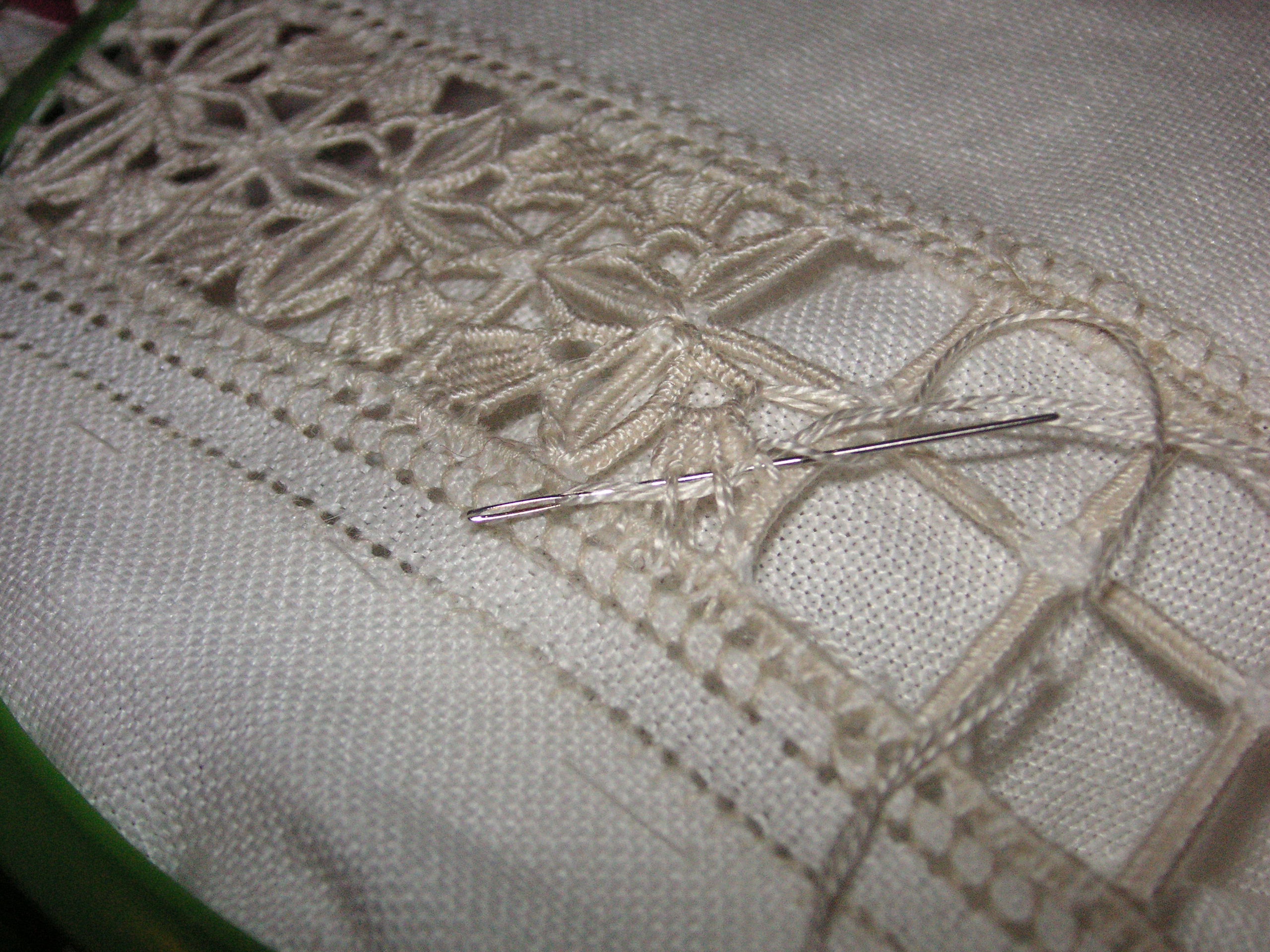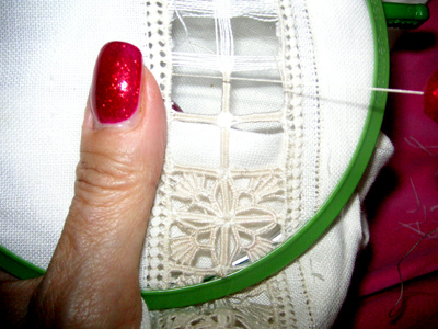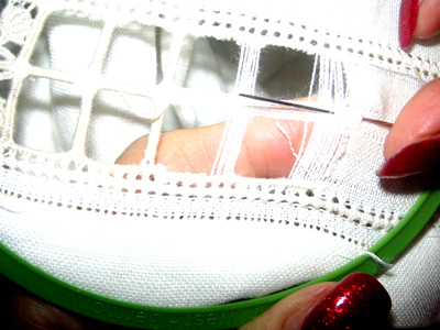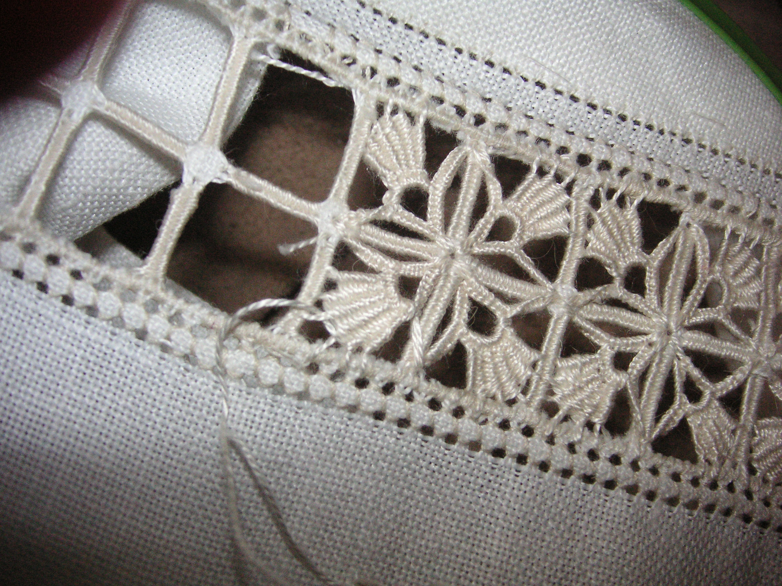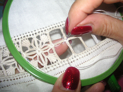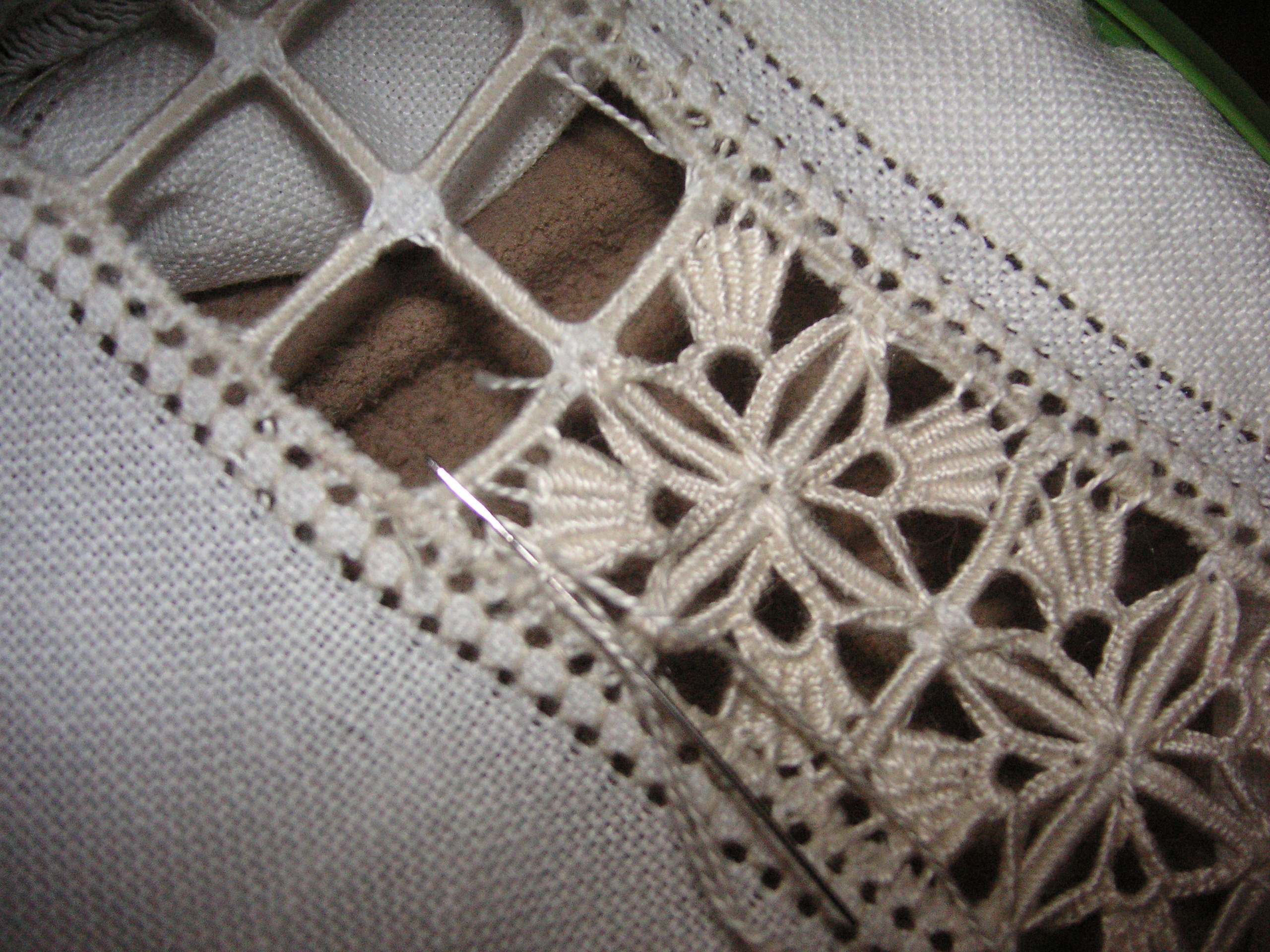 Fate attenzione quando vi aggangiate ,ad entrare nei singoli punti festone da sotto; nel lanciare i fili ai bordi dei quadretti badate di tenere la stessa distanza sui due lati del quadretto stesso; ora vi trovate con una raggera di sei fili lanciati ; siete al centro di nuovo nell’archetto , lavorate un punto festone e ora passando con l’ago fra i fili lavorate a punto tela sui sei fili lanciati fino ad arrivare al bordo del quadretto ; (6 foto ) ;ora lavorate solo su quattro fili sempre raggiungendo il bordo del quadretto (foto 7)e infine lavoratene solo due( foto 8 e 9).