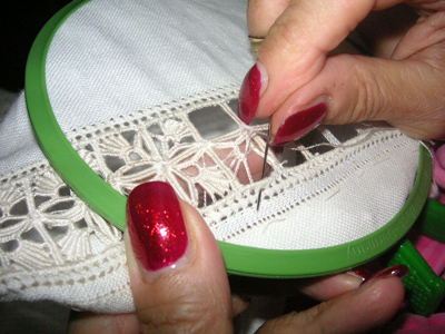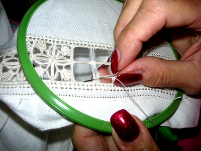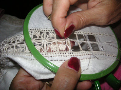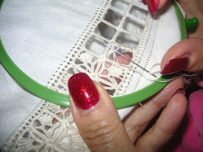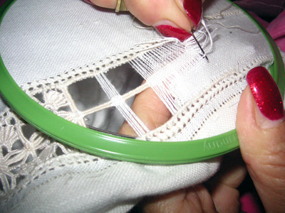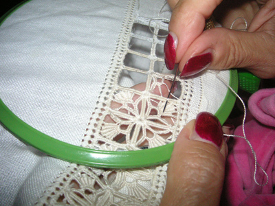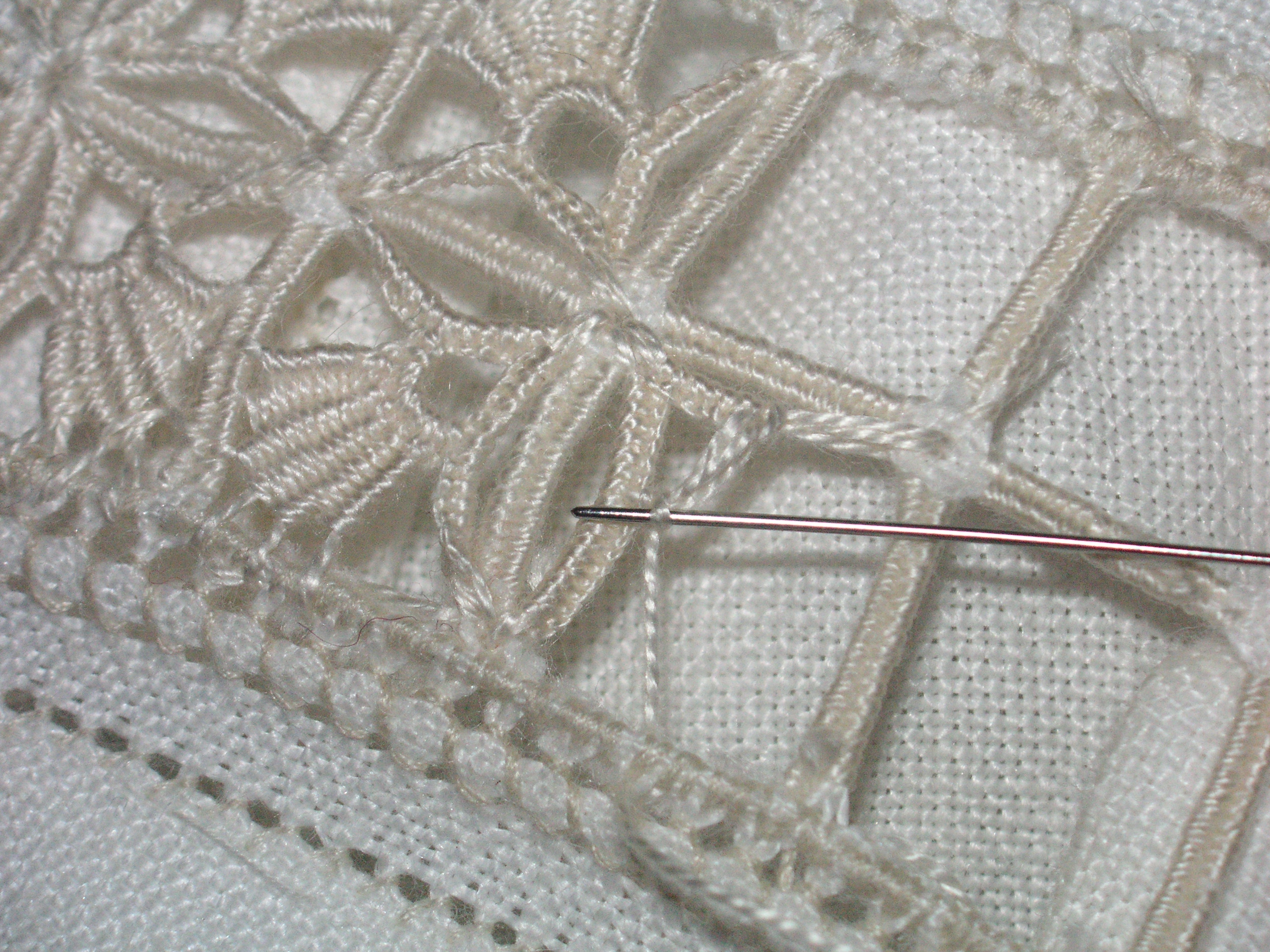 Girate il lavoro e da rovescio entrando con l’ago nel ventaglietto , all’interno dello stesso , risalite nuovamente all’archetto;tornate al diritto , lavorate un punto festone (foto 10) lavorate a punto festone il resto dell’archetto rimasto in sospeso e arrivate al bordo del qudretto ( foto 11)